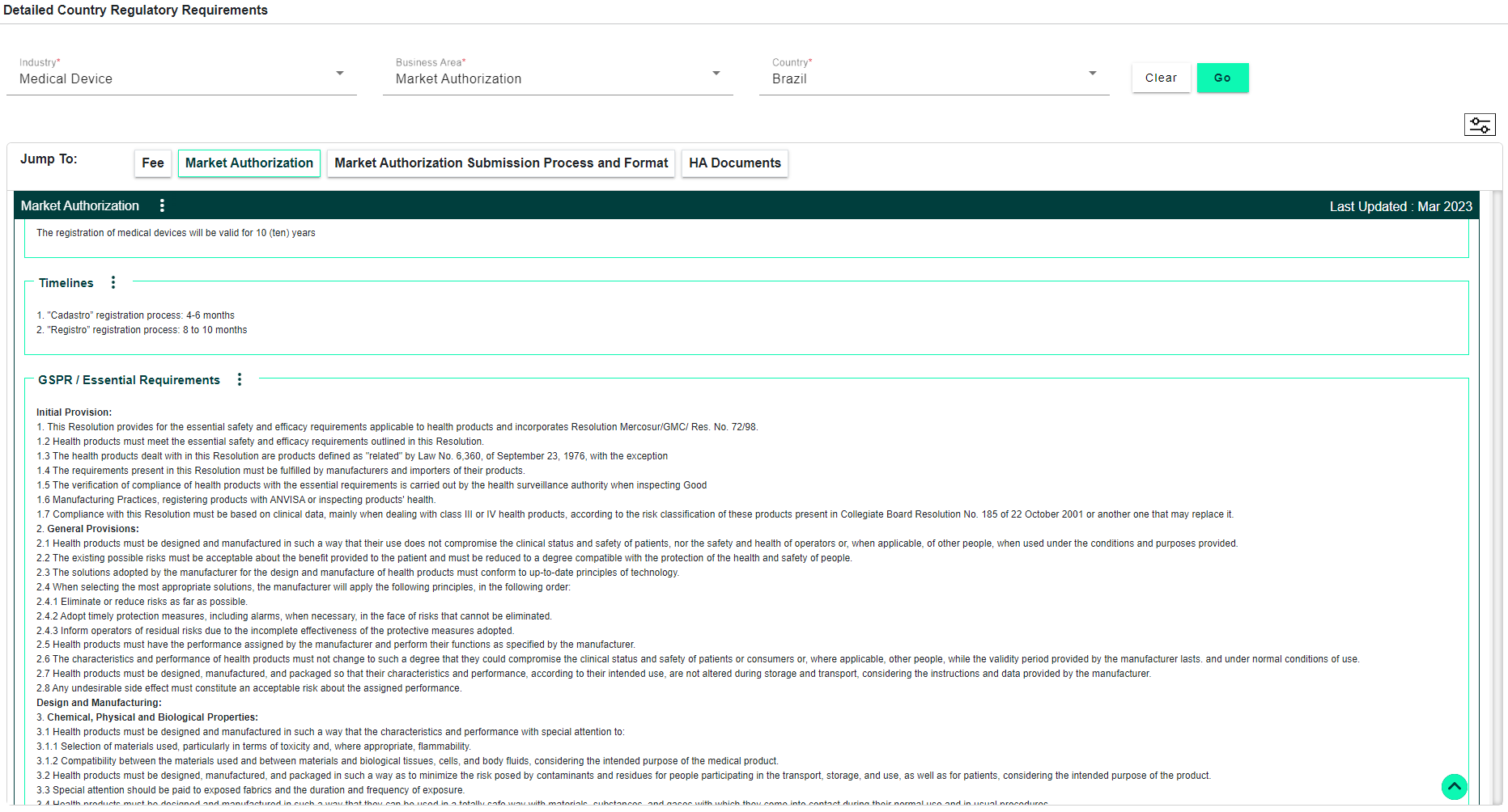 Global Regulatory Requirements Database (covers different business/functional areas including clinical, market launches, Vigilance, Testing standards, submission checklists, fees, labeling, import/export, marketing, safety/PV, renewals/variations and life cycle requirements)